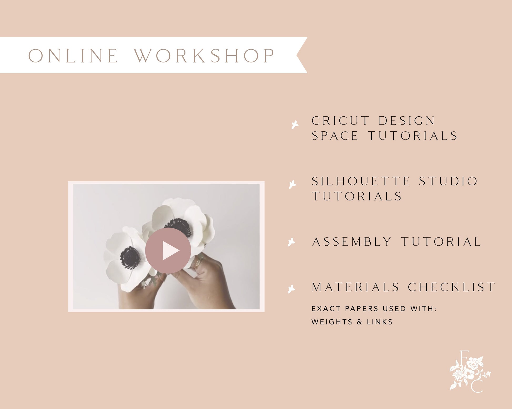 Learn how to make realistic, paper Anemone flowers from cardstock paper with your Cricut or Silhouette cutting machine in this online workshop! You can make two different looking anemones.