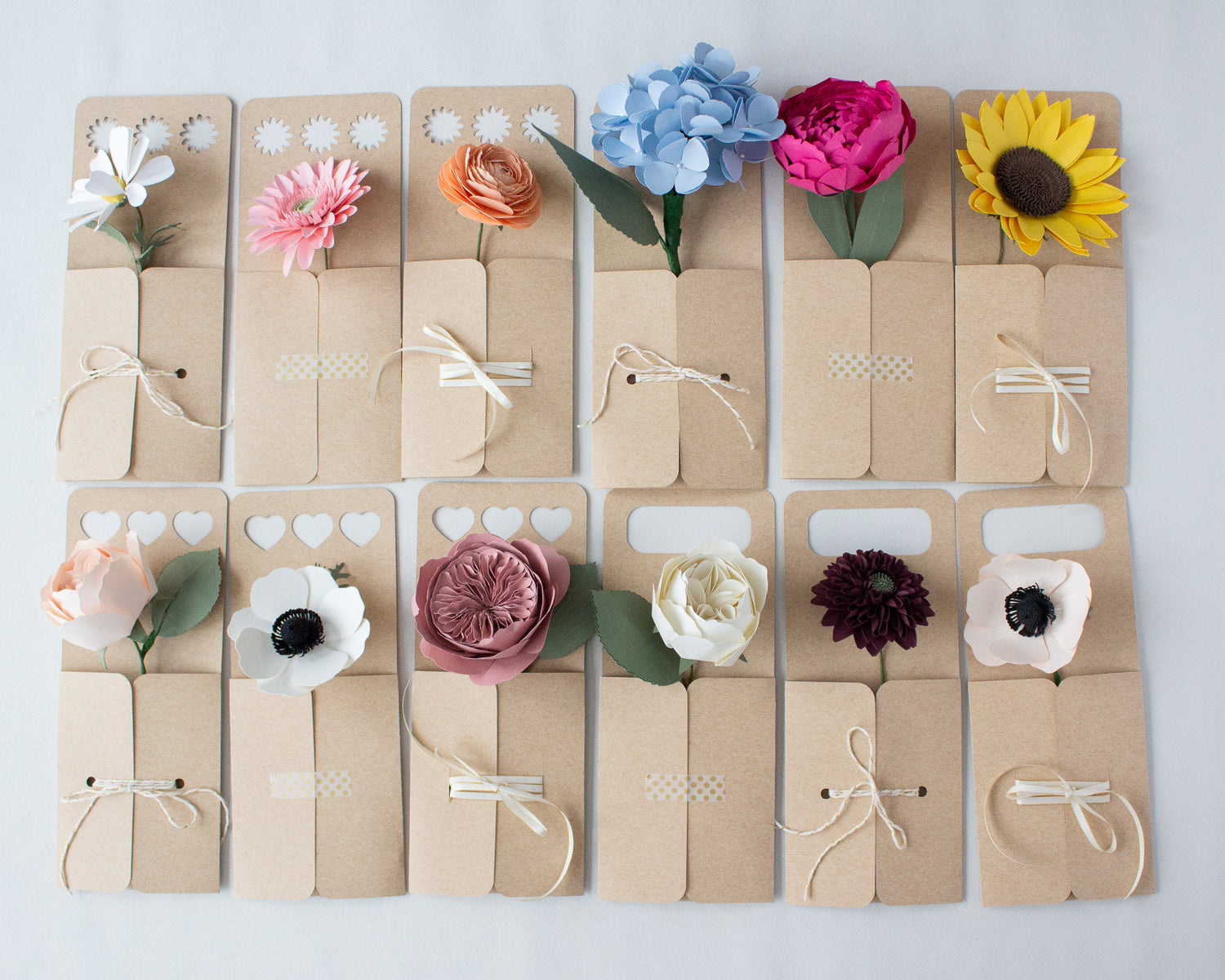Learn how to make beautiful packaging for your paper flowers with your Cricut or Silhouette cutting machine in this Mini Online Workshop. The included template makes 3 different flower holders with daisy cut out handle details. A hidden tab keeps the paper flower centered in the middle of the holder.