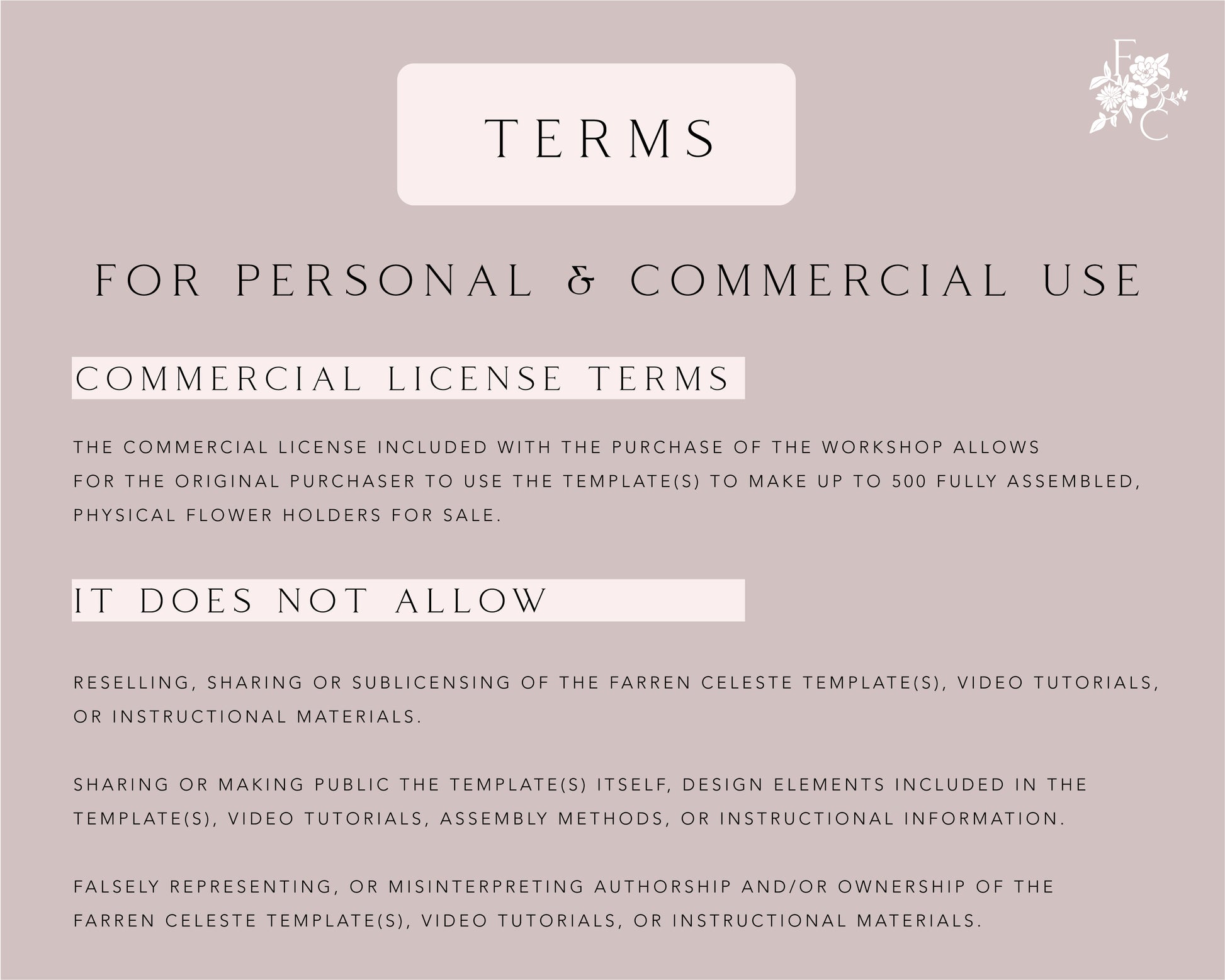 The commercial license included with the purchase of this workshop allows the original purchaser to use the included template(s) to make up to 500 fully assembled, physical [flowers/cards] for sale.