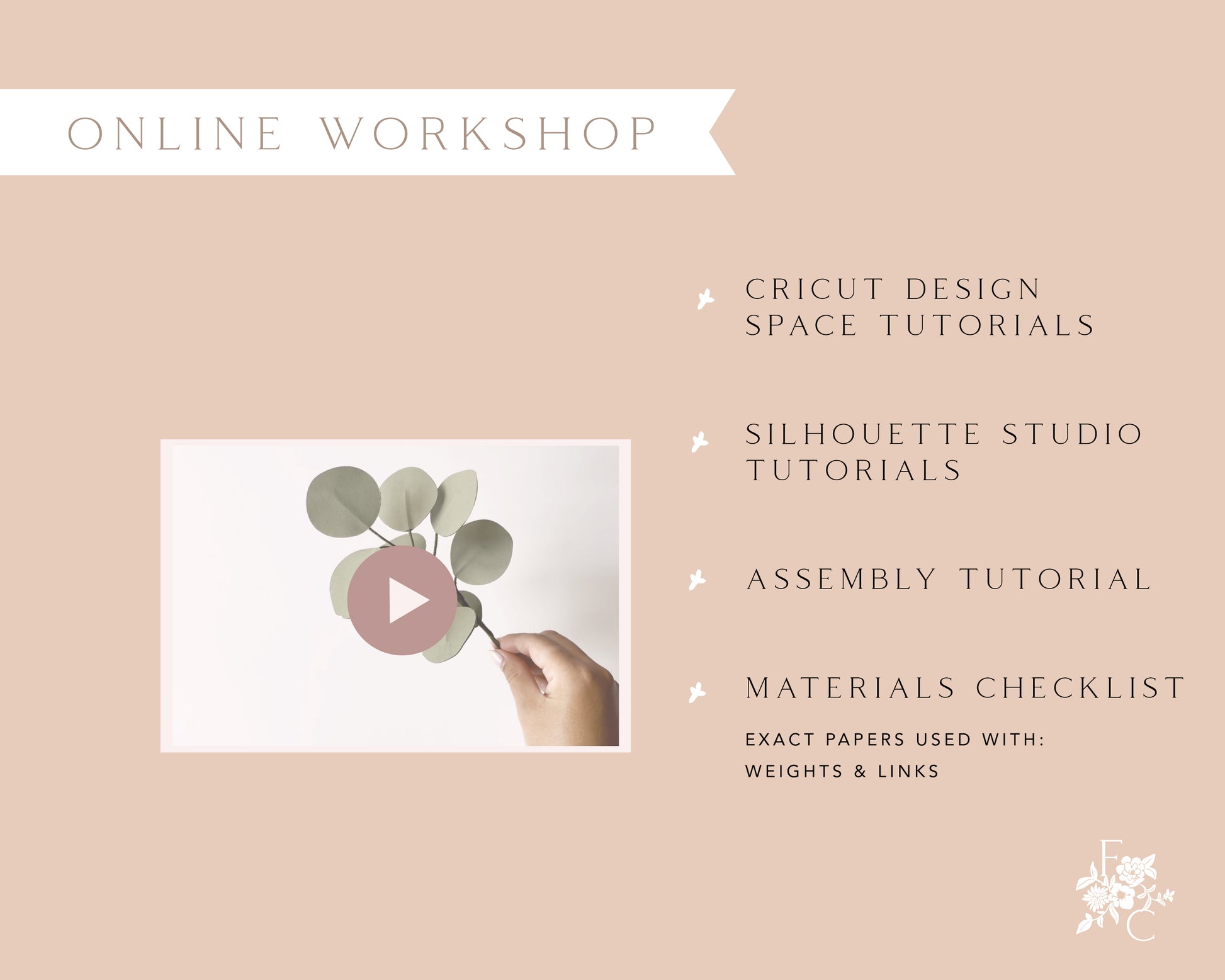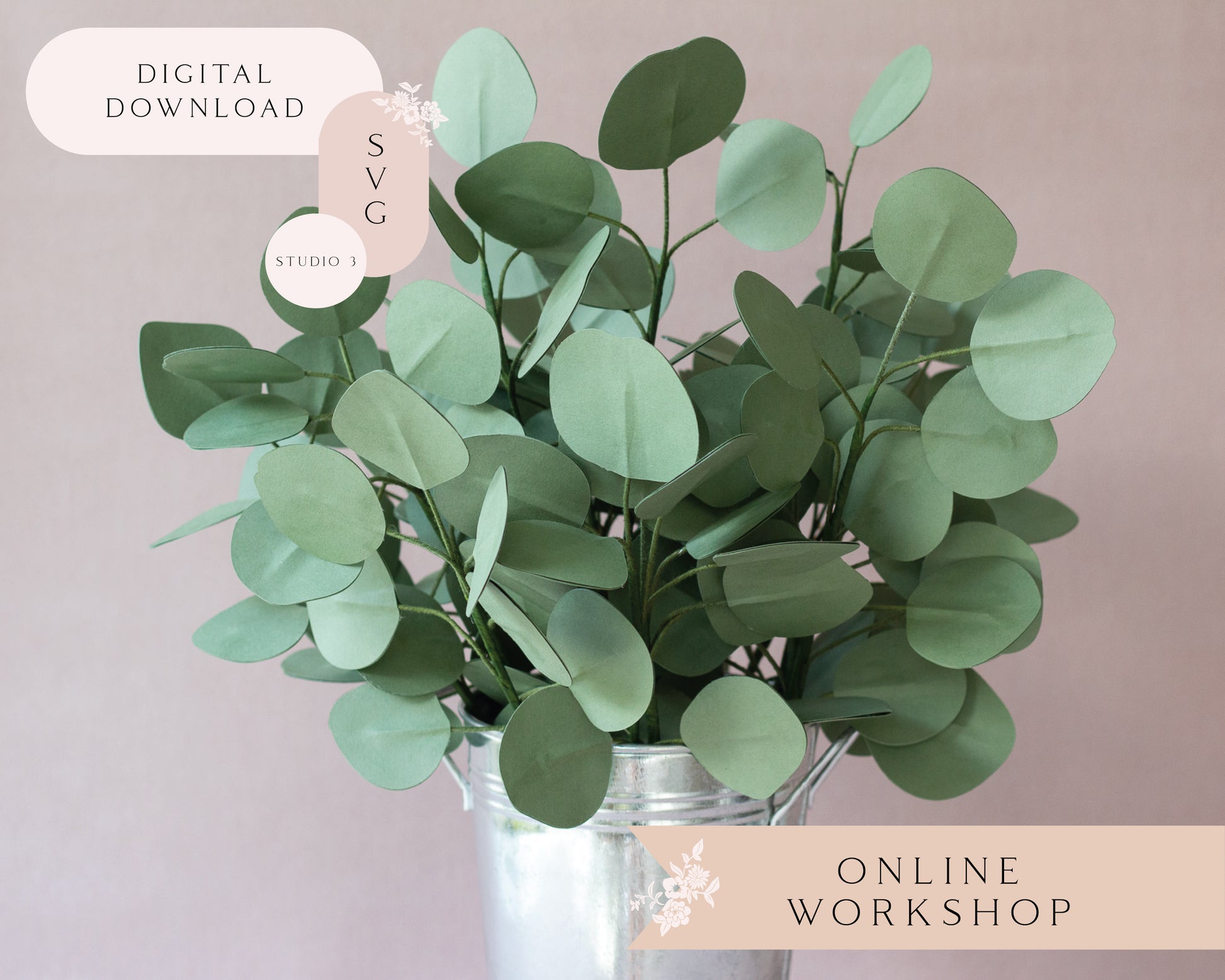 Learn how to make realistic, paper Eucalyptus Stems from cardstock paper with your Cricut or Silhouette cutting machine in this online workshop!