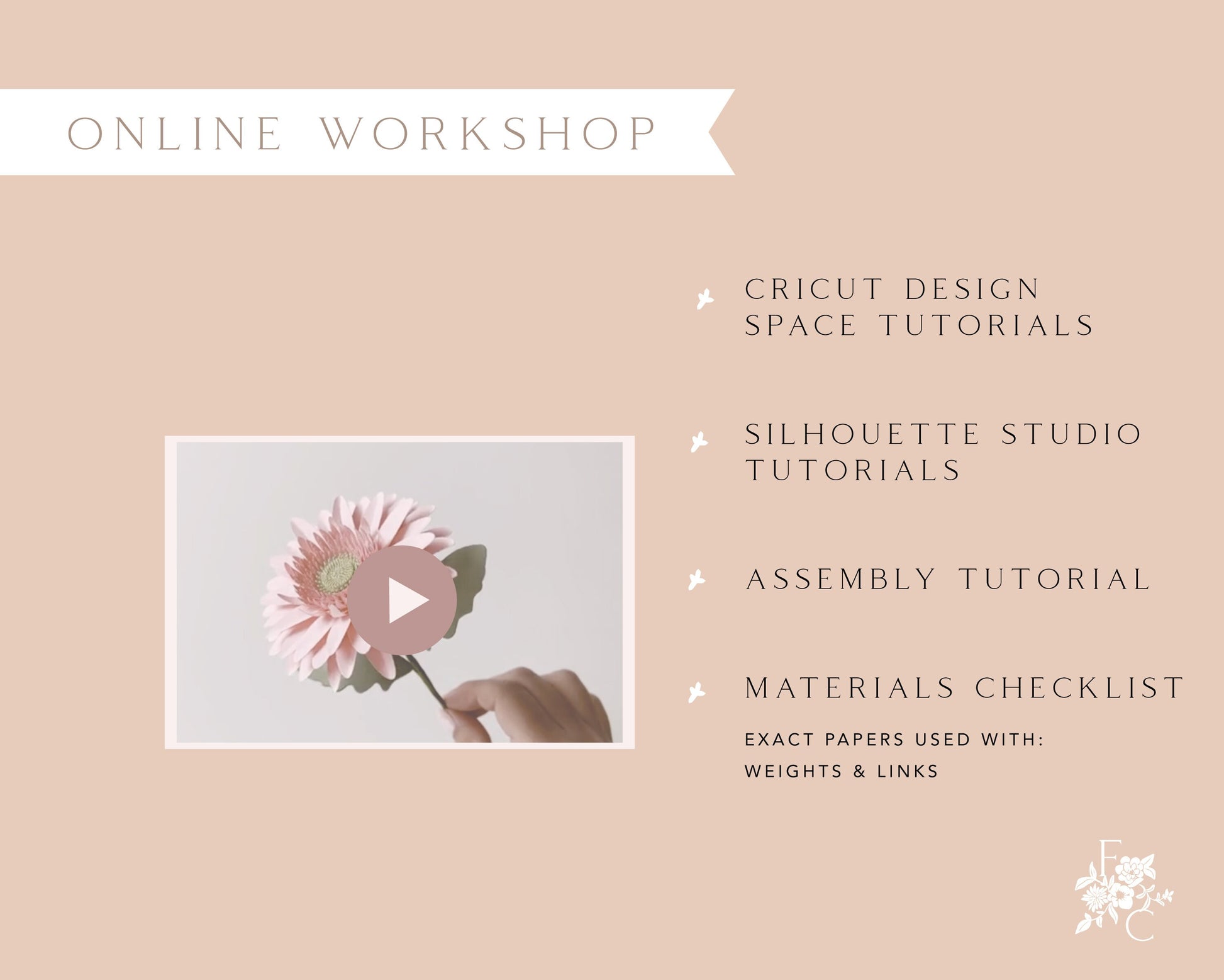 Learn how to make realistic, paper Gerbera Daisy Flowers from cardstock paper with your Cricut or Silhouette cutting machine in this online workshop!