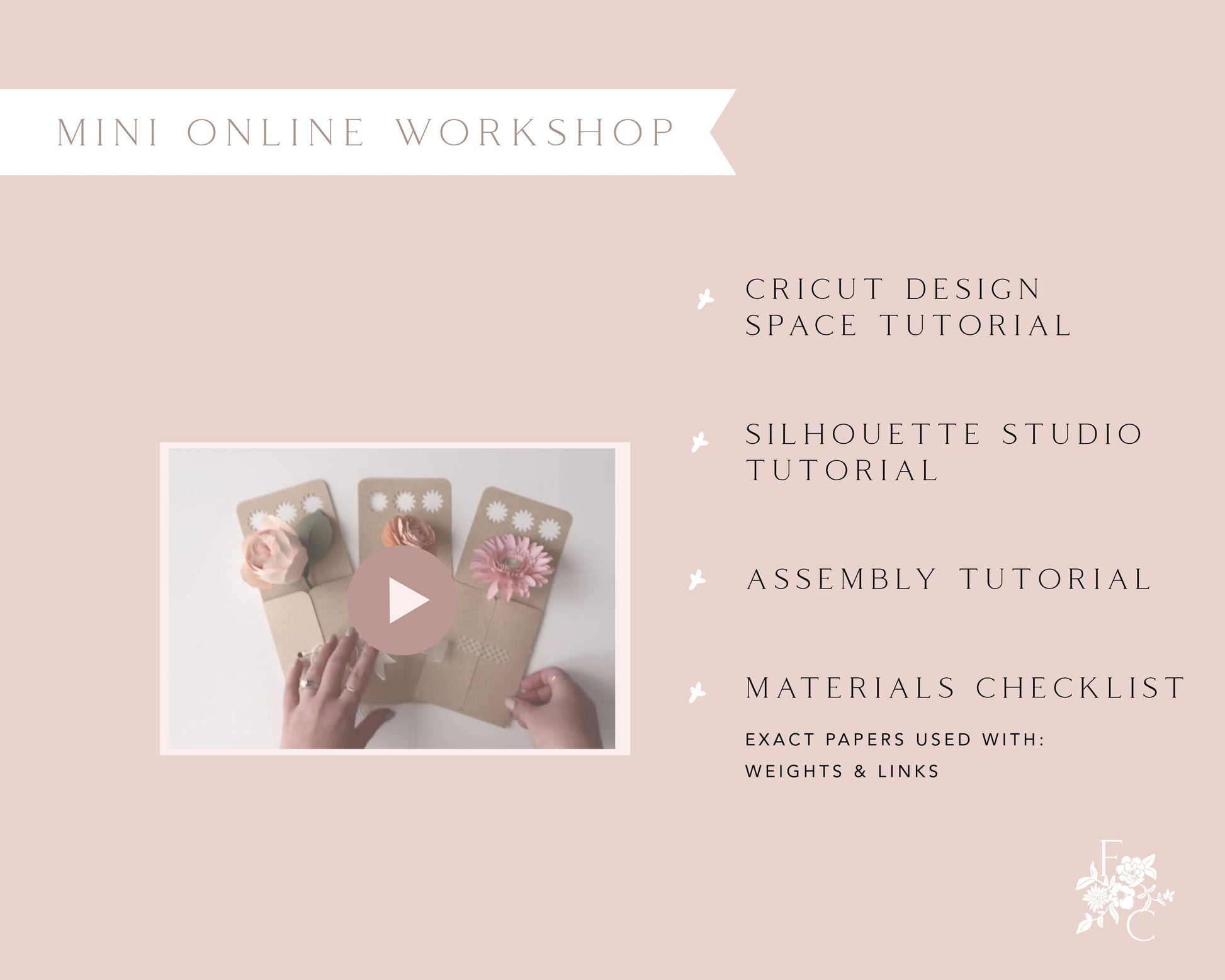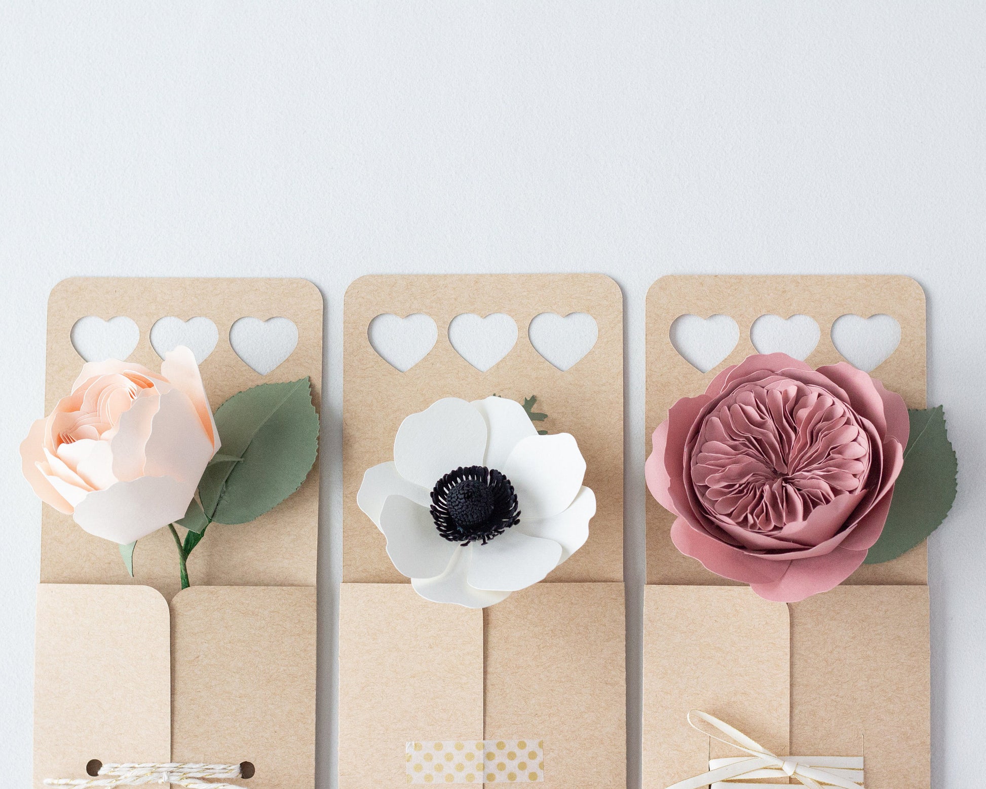 Learn how to make beautiful packaging for your paper flowers with your Cricut or Silhouette cutting machine in this Mini Online Workshop. The included template makes 3 different flower holders with heart cut out handle details. A hidden tab keeps the paper flower centered in the middle of the holder.