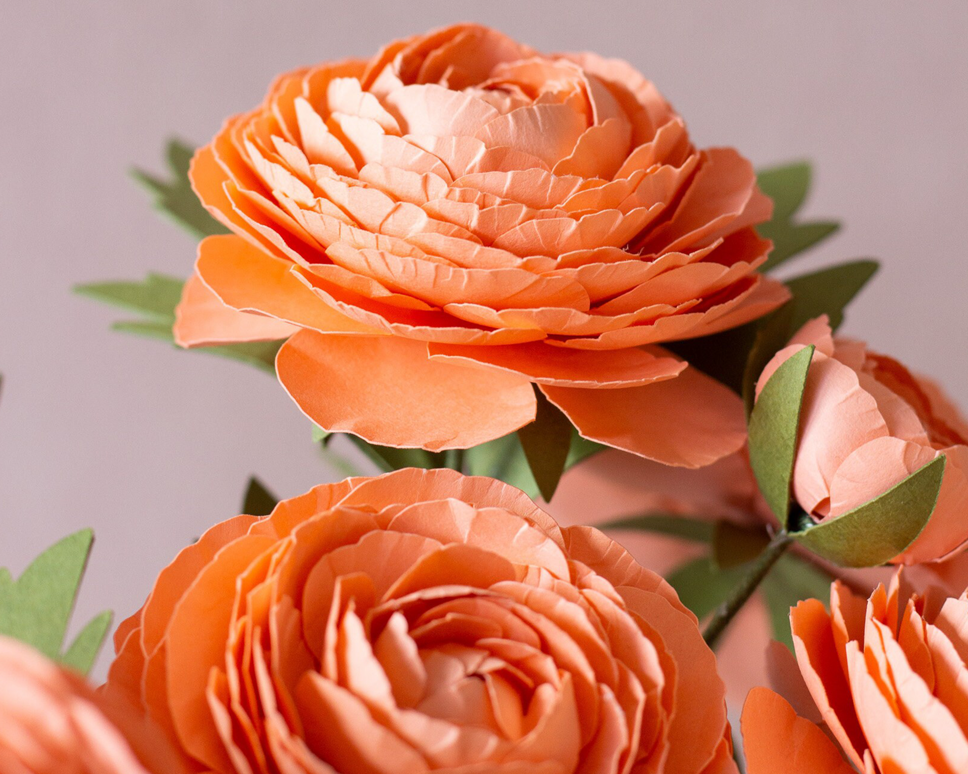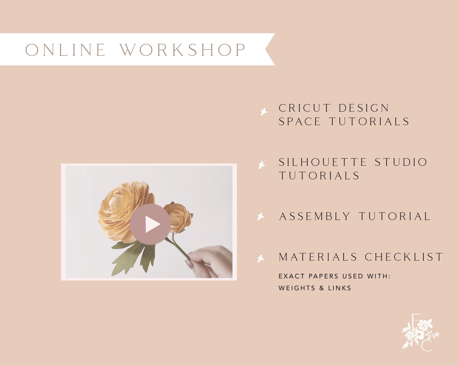 Learn how to make realistic, paper Ranunculus flowers from cardstock paper with your Cricut or Silhouette cutting machine in this online workshop!